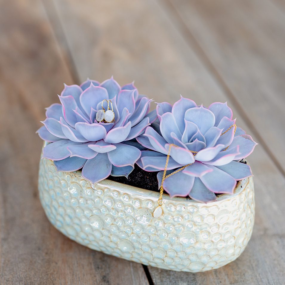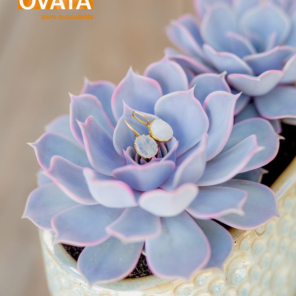 Echeveria moon pearl is named after the moonstone. Moonstones come in all kinds of softly glowing hues. Greyish is the most common, but white, yellow, pink, and cream are also possible; all with a satiny sheen. Moonstone is a very attractive material for jewellery because of the way it shimmers when you move it about. Just like Echeveria moon pearl.